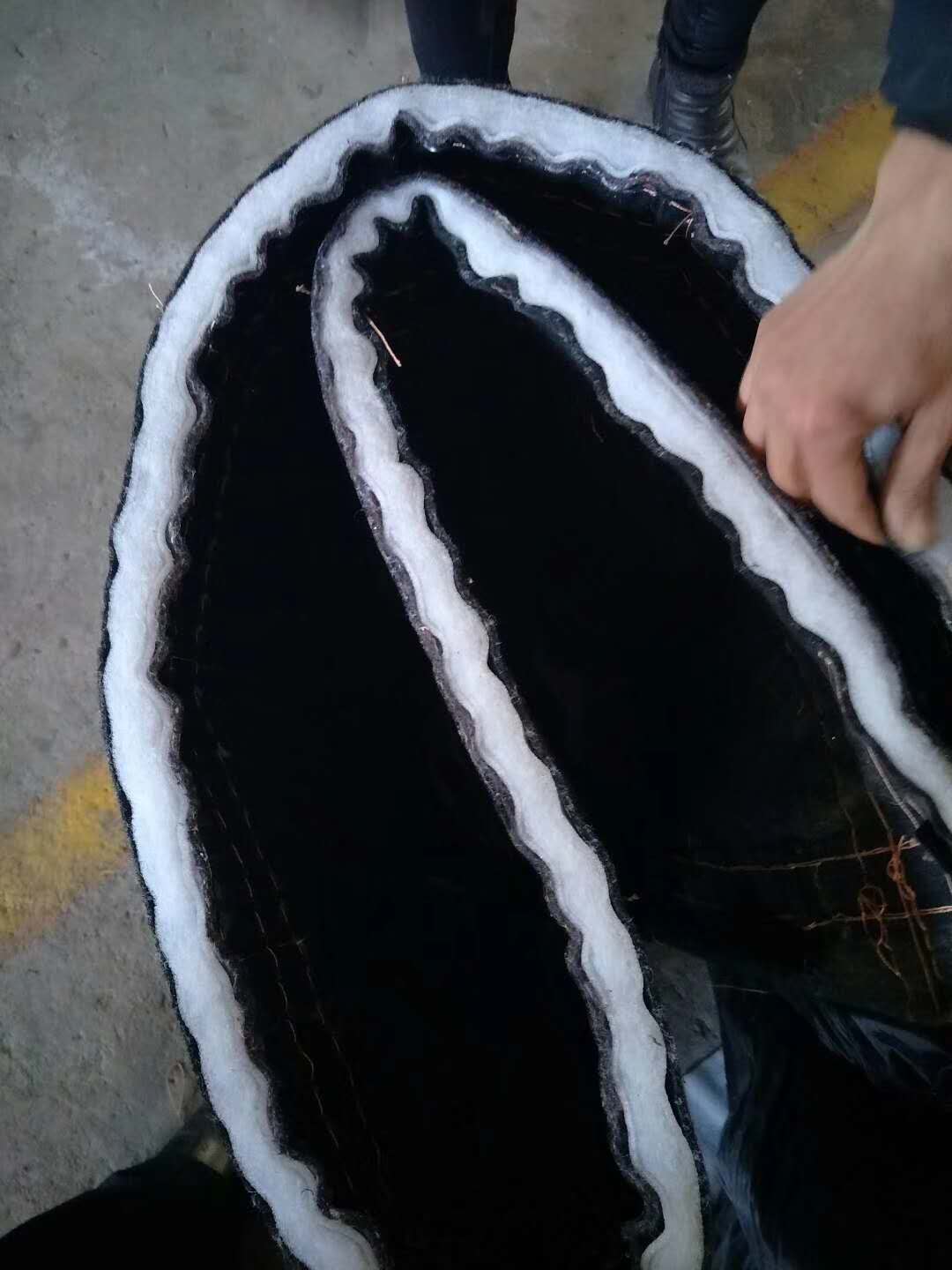 該種保溫被采用2mm厚蜂窩塑膜二層、加二層無紡布、外加化纖布縫合制成。該保溫被具有重量輕,保溫性好的優(yōu)點。適于機械傳動。經使用一個冬季后,反映出的缺點是里面的蜂窩塑膜和無紡布經機械傳動輾壓后容易破碎。